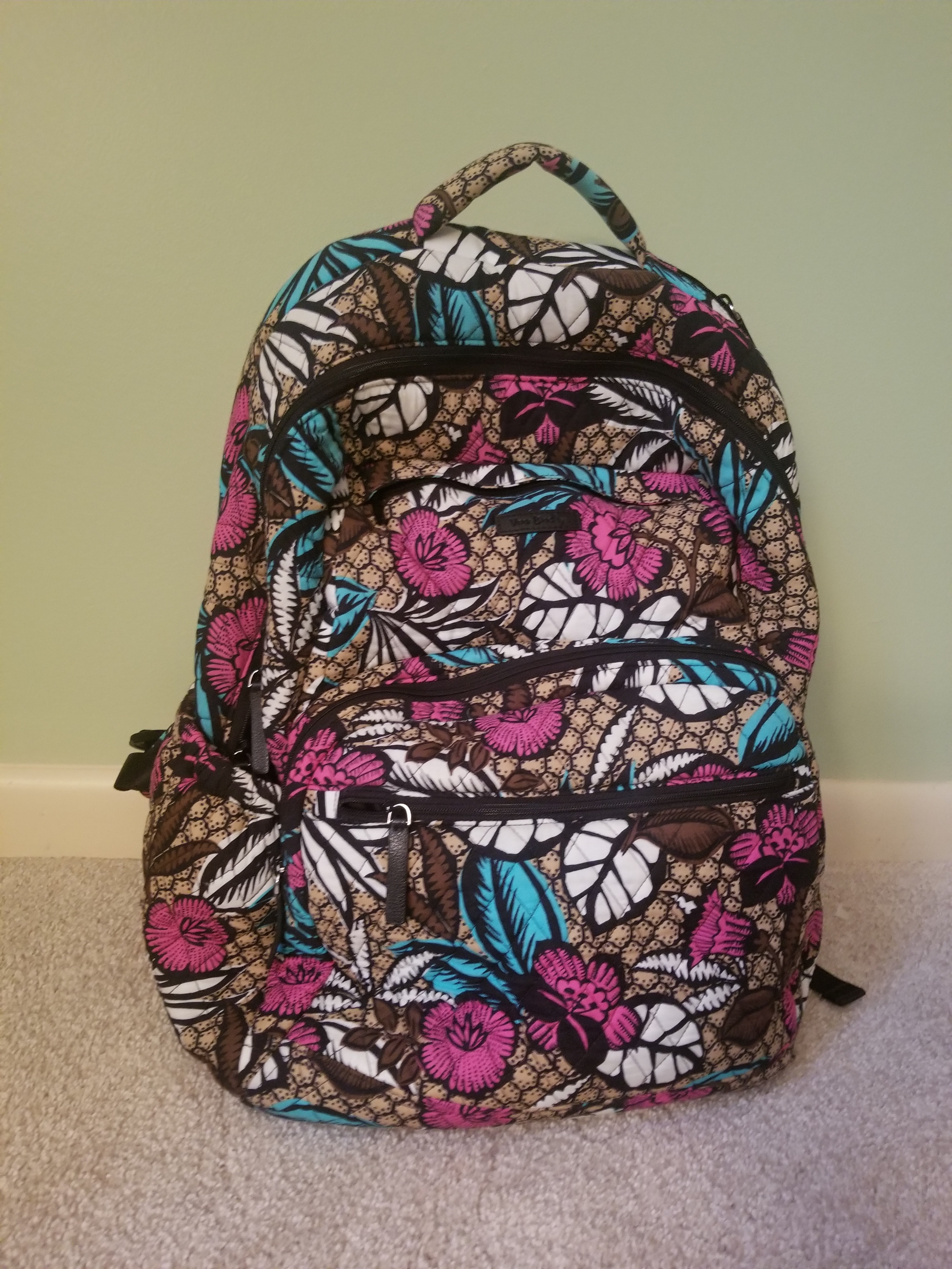 This past school year I was using a large tote with zero issue until I was off balance on some ice this winter. I prefer to travel and work without crutches, so I decided to cave and get a backpack. I went to Vera Bradley and found a pattern that I thought would be cute all year and hide dirt-it goes on the floor beside me a lot.
