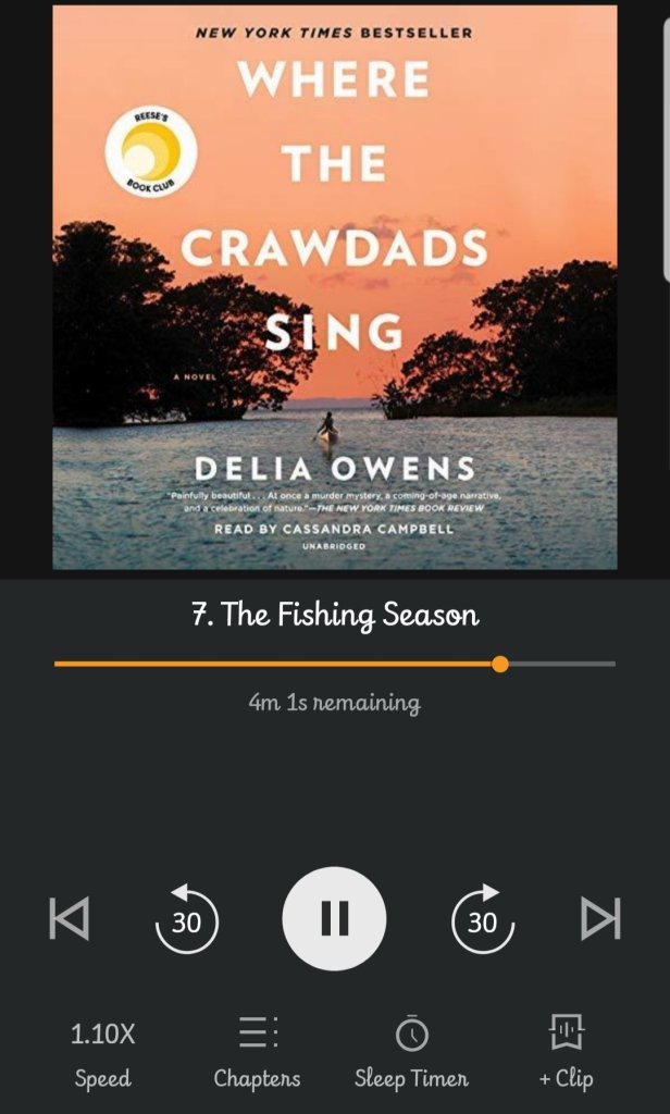 I first started with a book club book because I thought I could get those “pages” completed while I drive from school to school. I totally thought this was awesome mom juggling, but unfortunately our book selection was Where the Crawdads Sing. This book is a fantastic story, but not one for the school day. I found it to be a very emotional story. I was sort of bummed out going from school to school. I recommend this highly praised and purchased book if you are not a total over thinker like me. I let myself get lost in books and characters, sometimes to a fault, so my lack of desire to push play is no reflection on the text.
