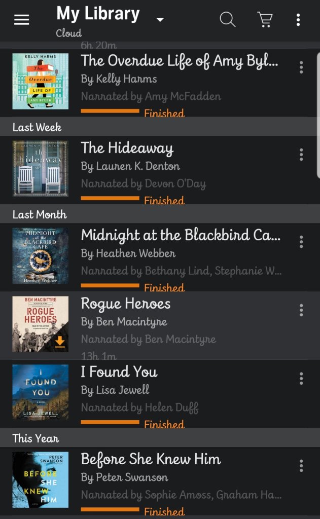This was my freebie with my Amazon Audibles membership. It is a quick little novella. The story was not as funny as The Overdue Life of Amy Byler, but I kept listening. It tugged at heart strings, without taking me down a overthinkers rabbit hole. It took a day or 2 of driving to zip through.