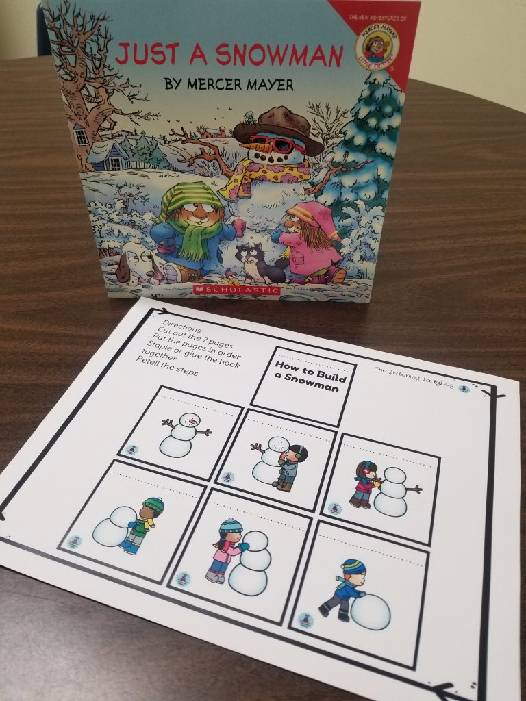 Froggy books are not my personal favorite, but my students like them, sonwhen I saw this one I knew I had to grab it. I also knew it would fit into my snow theme for January. My students will assemble a snowman after we read and discuss the story. I intend to have them cut and sort the pieces, then listen for what pieces they can select for gluing. I always try to squeeze in listening somewhere!
